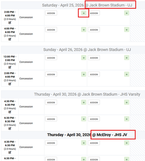 Scroll through the available concession shifts until you find a desired time slot. Please note the location of the concession shift "Jack Brown Stadium" or "McElroy". Select the shift you would like to volunteer for by selecting the "+" icon next to your desired shift